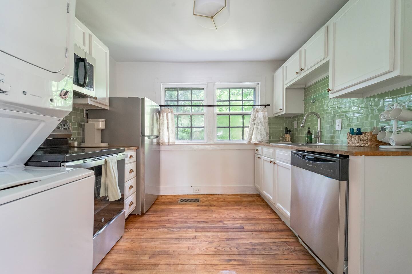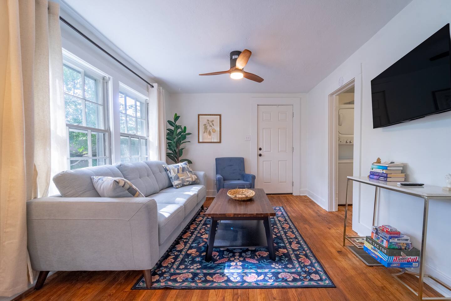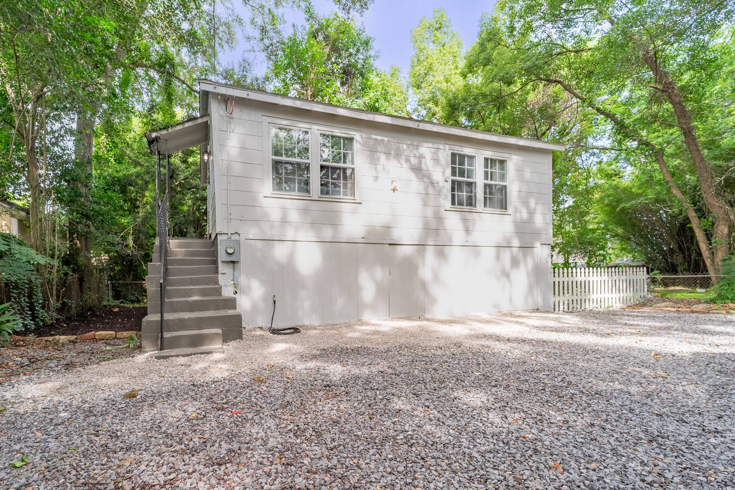 Guest access is through the front door. For your convenience, self check-in is available via a lockbox located on the handrail at the top of the stairs leading to the unit. Please note that you’ll need to climb the exterior staircase to access the apartment.